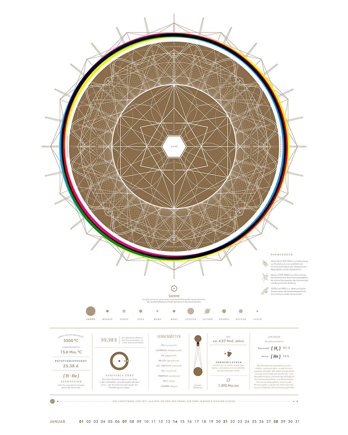 Beflügelt von Phantasie und Physik führt die Kalendermission 2018 zwei Welten zusammen: Facettenreiche Illustrationen, bei denen sich alles um die Planeten unseres Sonnensystems dreht, und wissenschaftliche Fakten und Besonderheiten dieser geheimnisvollen Himmelskörper. SUN MOON STARS ist eine Entdeckungsreise in unser Sonnensystem, visuell überraschend und informativ zugleich. Beim diesjährigen GREGOR CALENDAR AWARD wurde SUN MOON STARS unter über 800 Einsendungen mit SILBER ausgezeichnet.